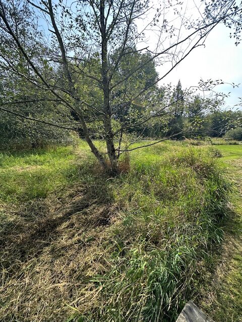 Overgrown vegetation throughout the property, especially within the existing drainage swale connected to the roadside ditch.